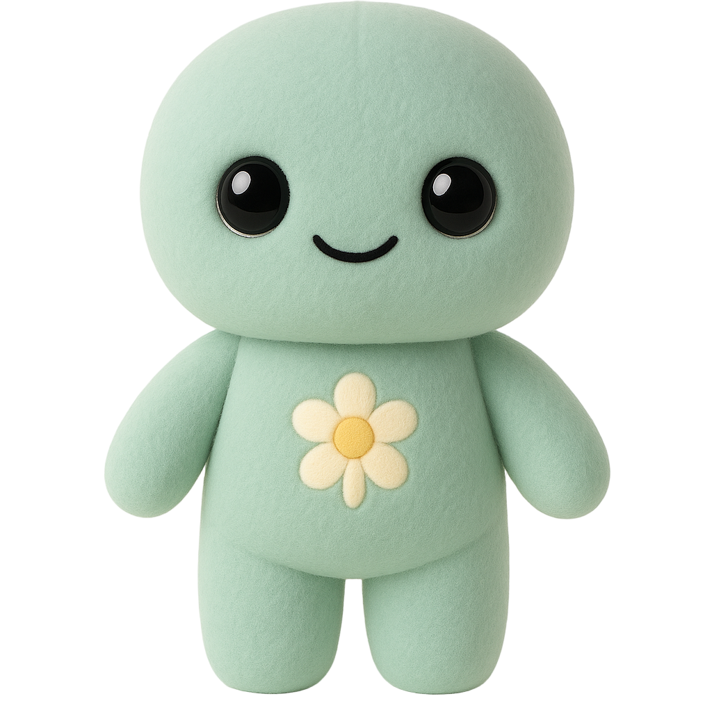 Pastel mint with a bright daisy emblem, this plush brings freshness and sunshine wherever it goes. A vibrant comfort character for flower lovers and soft-aesthetic collectors.
